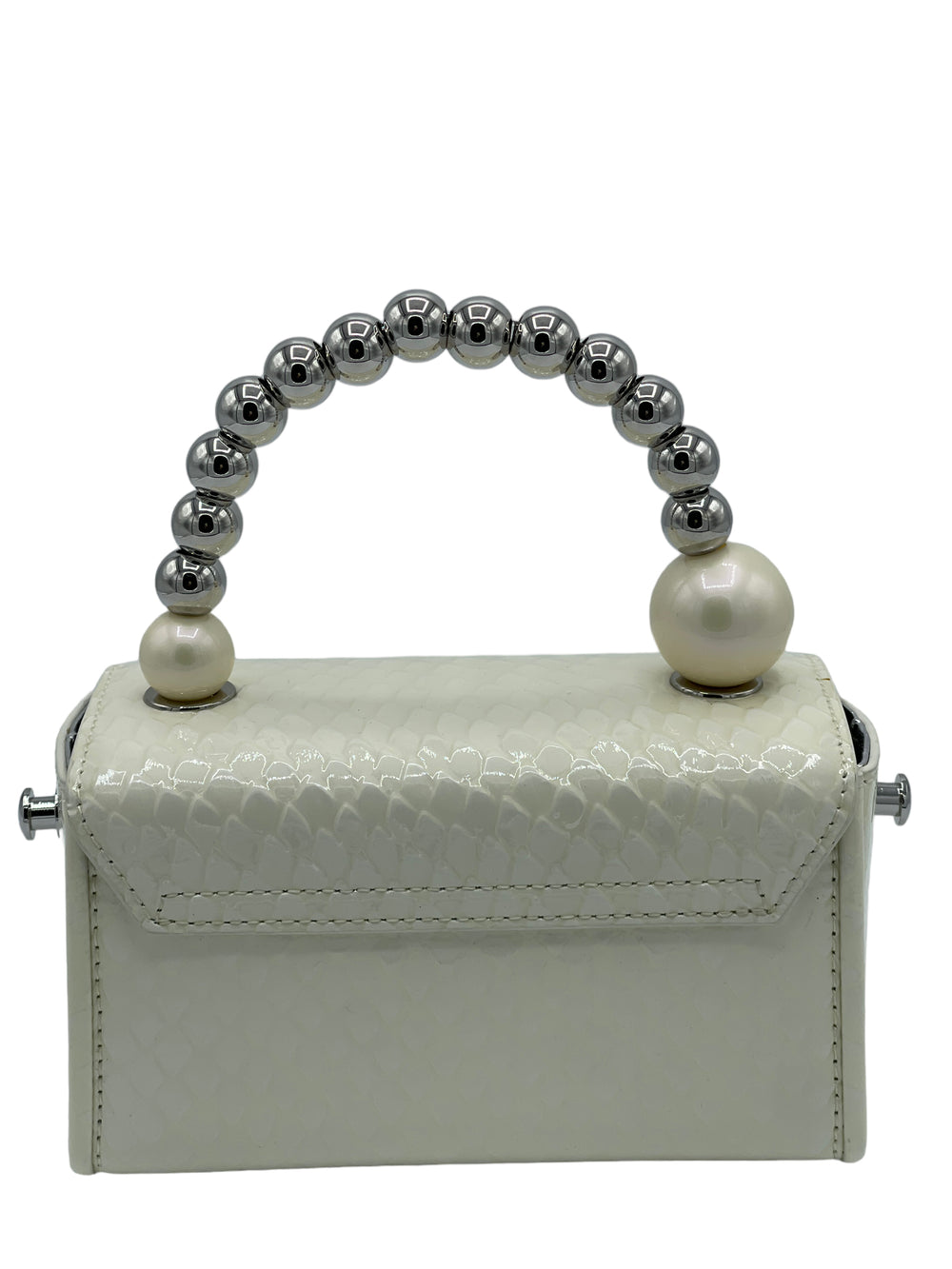 This White Print Leather Purse is a stylish and attractive accessory for any wardrobe. Crafted from genuine leather, it features a mini snakeskin print and a large bead handle shoulder strap. The purse measures 6.3in wide, 3.5in high and 2.9in deep and a 43in strap. The perfect combination of fashion and function, this purse is sure to turn heads.