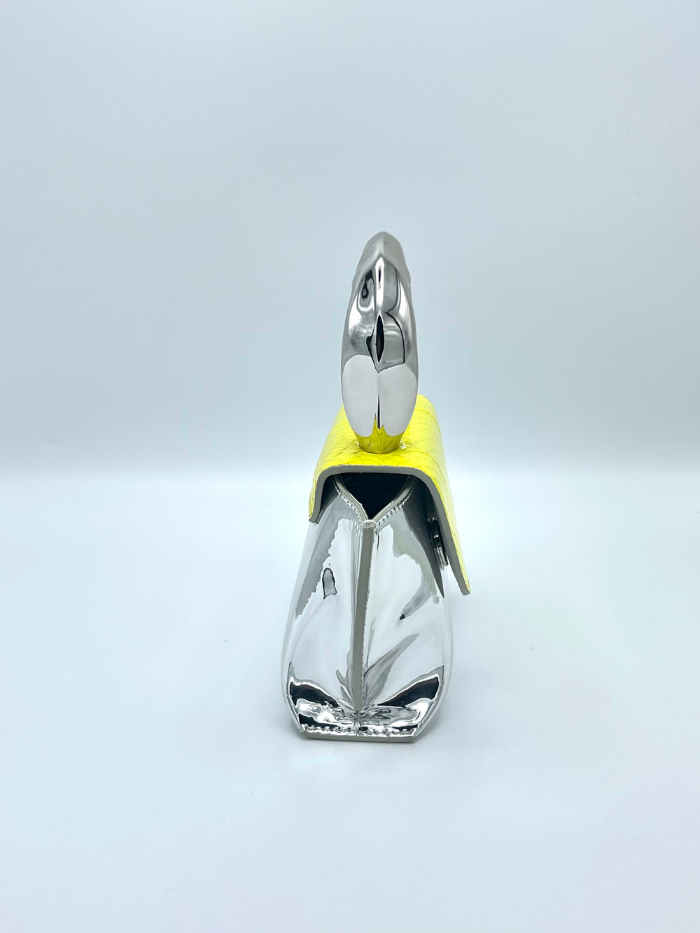 This stylish Yellow On Silver Purse is the perfect accessory for any outfit. The single handle is set on an embossed yellow leather flap, and the silver purse chain shoulder strap adds a touch of sophistication.